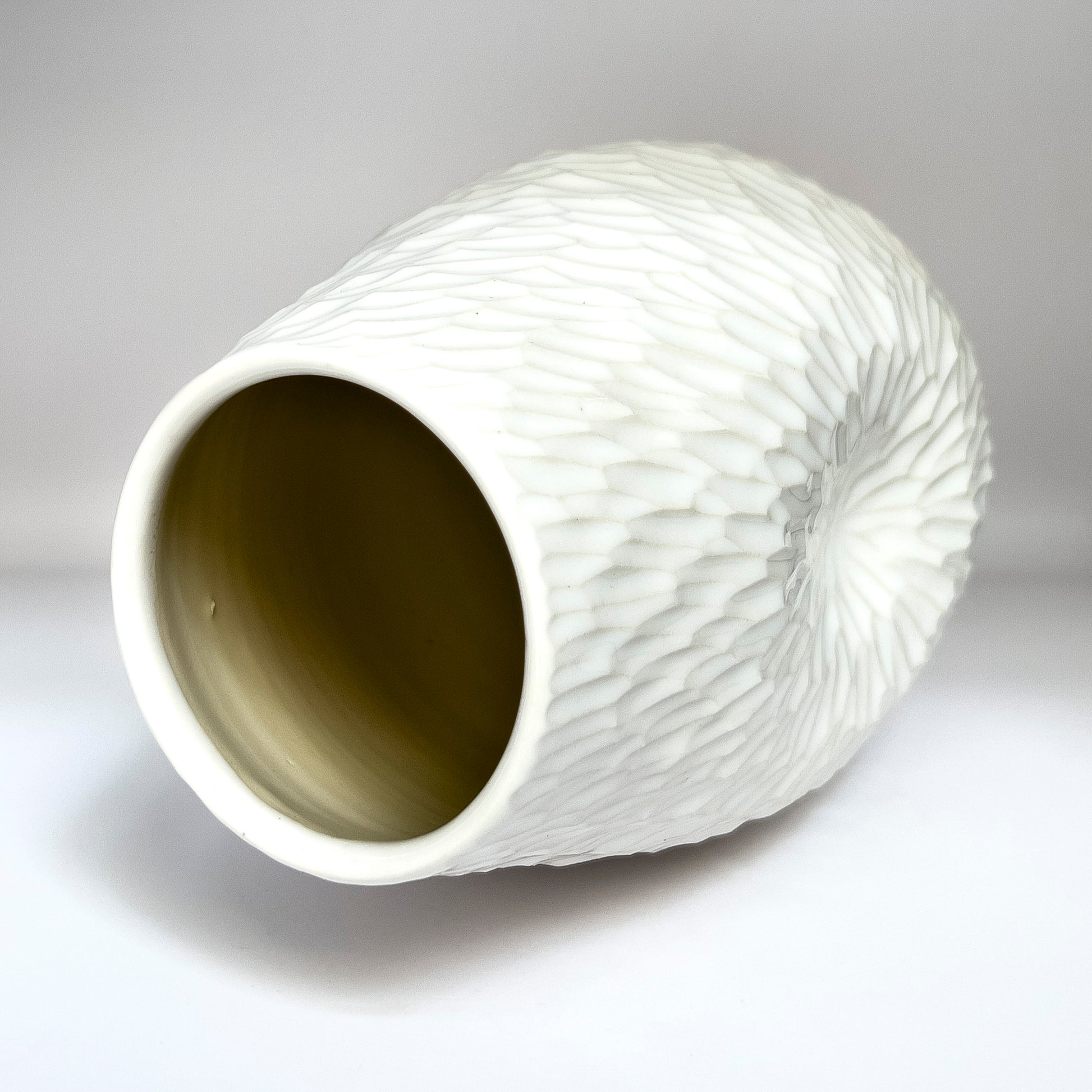 Wheel-thrown, hand-carved porcelain vase. Exterior is hand-painted snow celadon, interior glaze is clear. Height: 7.5 inches.